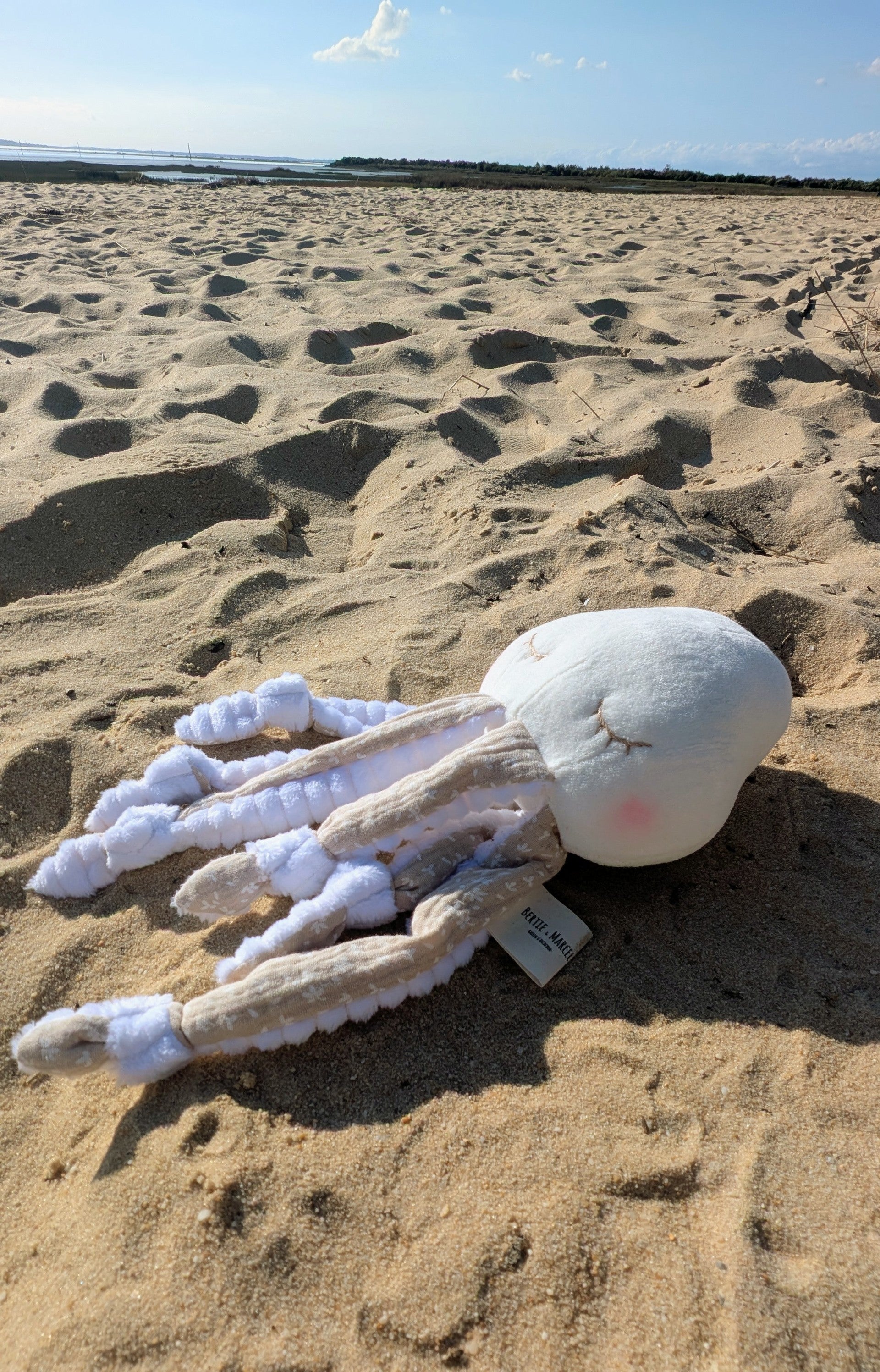 Découvrez Alma, la petite méduse du bassin d'Arcachon, toute douce au toucher. Ses tentacules noués sont spécialement conçus pour apaiser et rassurer bébé, offrant un confort naturel et apaisant. Un compagnon tendre et rassurant pour vos tout-petits.