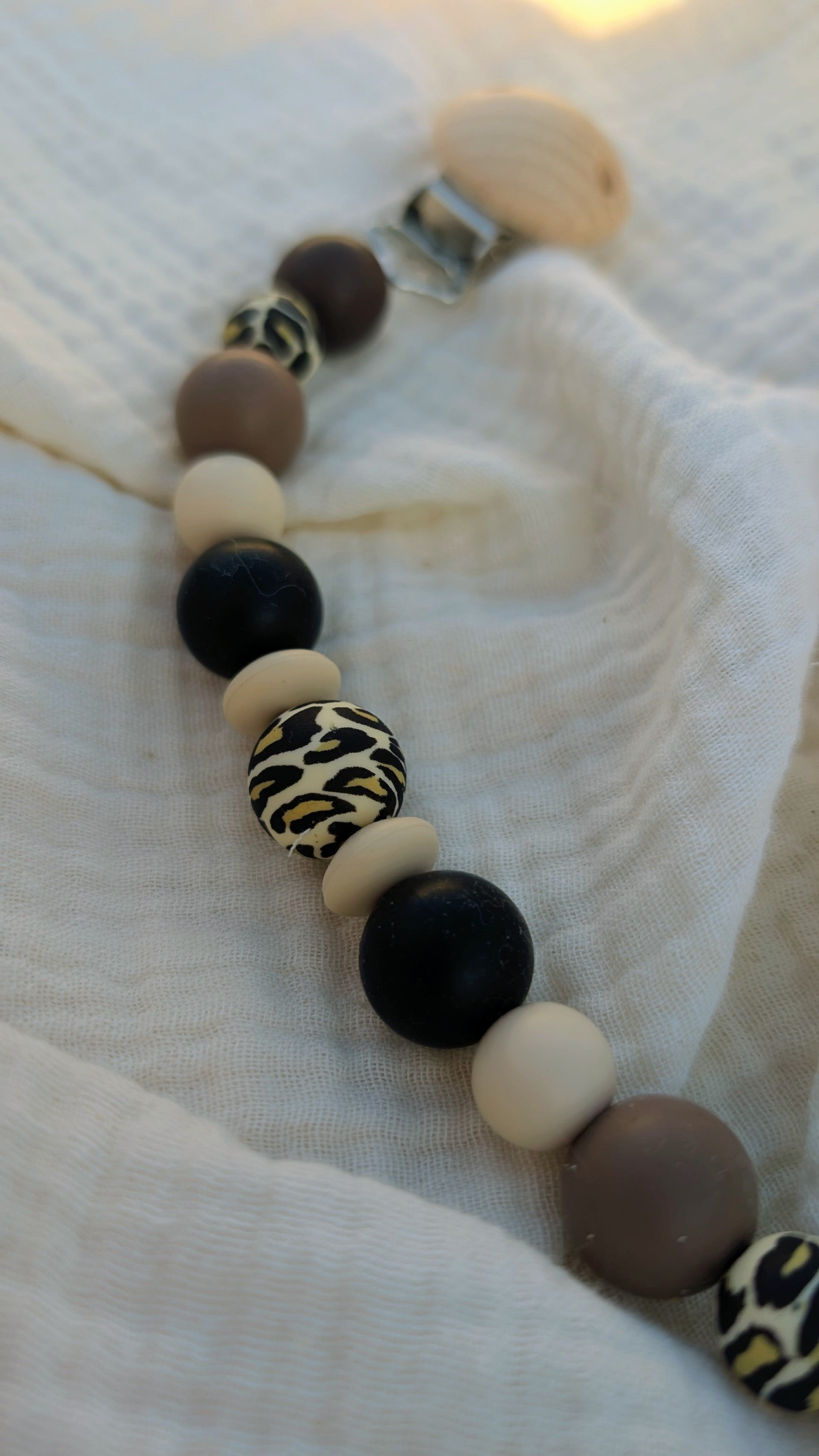 L'attache tétine en perles de silicone motif Léopard assure que la tétine de votre bébé reste toujours à portée de main. Facile à nettoyer à l'eau, elle combine praticité et hygiène pour accompagner votre enfant en toute sécurité.